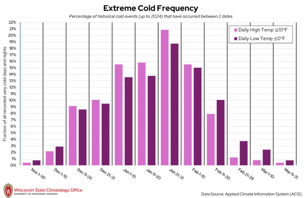Milwaukee County can get quite chilly once winter rolls around! Some of our coldest days of the year in Wisconsin are when the overnight low temperatures dip below 0°F. The State Climatology Office performed an analysis on the likelihood of a “very cold day” (daily high temperature ≤ 10°F) or “very cold night” (daily low temperature ≤ 0°F) occurring between two calendar dates using historical measured temperature data from NOAA stations in Milwaukee County. Based on this analysis, very cold days and nights have occurred most frequently between January 21 to 31. Over the past 20 years (2005-2024), Milwaukee County experienced, on average, five very cold days per year and 18 very cold nights per year.