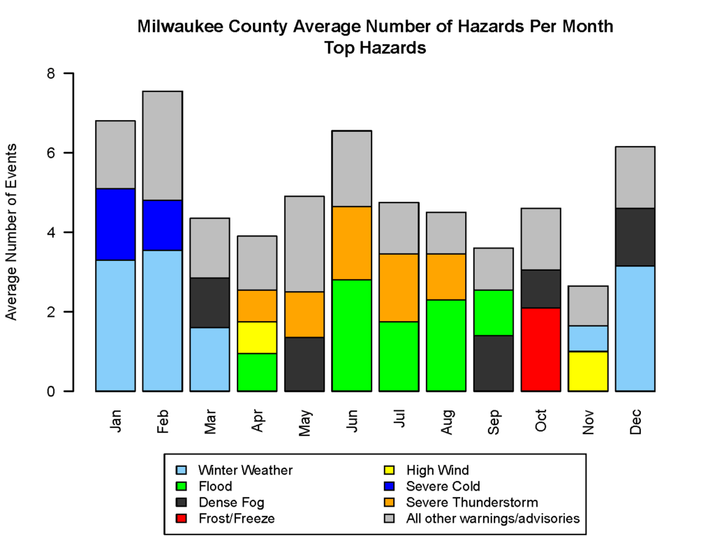 Milwaukee County deals with an array of hazardous weather throughout the year, and the type of hazards vary from season to season. The bar chart and table above are summaries of warnings and advisories issued by the National Weather Service for Milwaukee County over the past 20 years (2005-2024). Looking at hazards by month/season, the months of December through March are characterized by severe cold, snow events, and dense fog. Severe thunderstorms and flooding are more common in the late spring through summer. Frost advisories and freeze warnings are most common in October as this is the time of year when we are transitioning out of the growing season, and plants are susceptible to frost. High wind events tend to occur most frequently in April and November. Overall, the most common hazards in a year in Milwaukee County are winter weather, floods, and dense fog. Tornadoes are less common, with one tornado warning issued every two years for the county, on average.