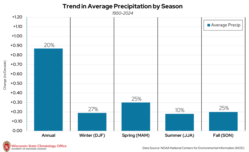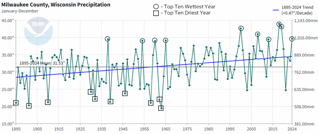 Annual precipitation shows a lot of year-to-year variability, which is normal within a long-term trend. However, there are two notable trends that come from this dataset. First, precipitation is increasing at a rate of 0.47 inches per decade from 1895 to 2024. That’s an increase of one inch approximately every 21 years. Second, if we look at the top ten wettest years since 1895 (black circles), five have occurred within the past 20 years. By contrast, all of the top ten driest years (black squares) occurred prior to 2000. These trends are quite similar to what has been observed in Milwaukee County with temperatures since 1895.