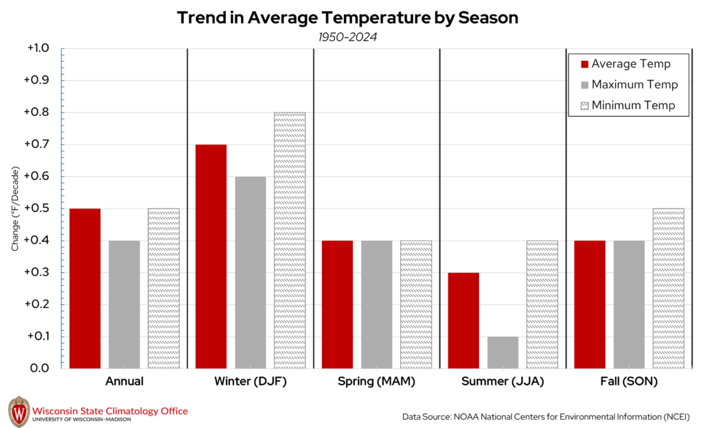 Temperatures have been increasing since 1950 in Milwaukee County on the annual and seasonal time scales, which is the case for most of Wisconsin. Since 1950, annual average temperatures in Milwaukee County have increased at a rate of 0.5°F/decade, which translates to an increase of 1°F every 20 years. This increase in temperature has been most pronounced in the winter months and less pronounced in the other seasons. When annual average temperatures are split into daily high and low temperatures, low temperatures have been warming at a faster rate compared to high temperatures across most seasons.