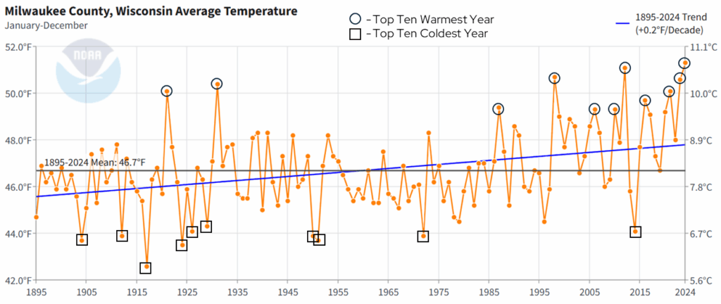 With temperatures warming, this does not mean that every year will be warmer than the last, or that more recent years will all have above-average (1895-2024) temperatures. However, Milwaukee County is experiencing more years that are above average than it did in the past. For example, since 2000, Milwaukee County has experienced only five years with below-average temperatures. Similarly, if we rank the top ten warmest years in Milwaukee County since 1895 (black circles on the above chart), six have occurred since 2000. The top ten coldest years (black squares) are a bit more clustered towards the earlier years in this time period, with just one of the top ten years occurring since 2000.