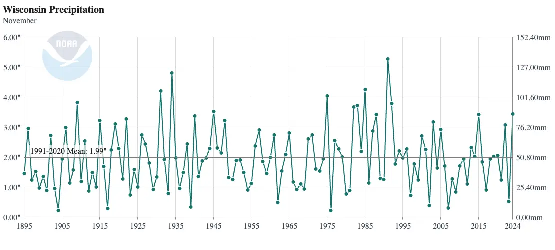 November in Wisconsin is typically significantly drier than October, averaging under two inches of precipitation across the state.
