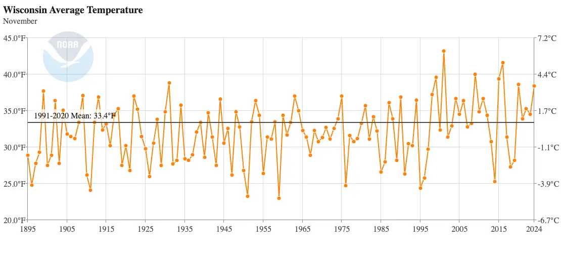 Wisconsin’s average temperature for November is just barely above freezing, at 33.4 degrees Fahrenheit. As temperatures get colder through the month, the waters of some smaller lakes often freeze over, including Madison’s Lake Wingra.