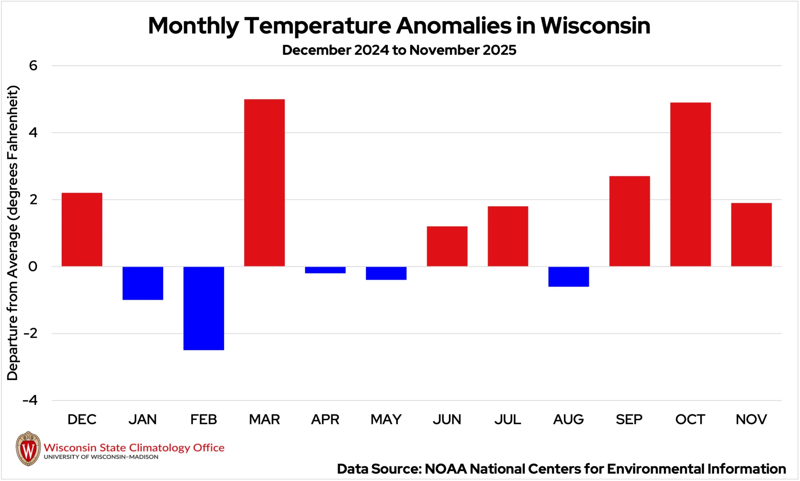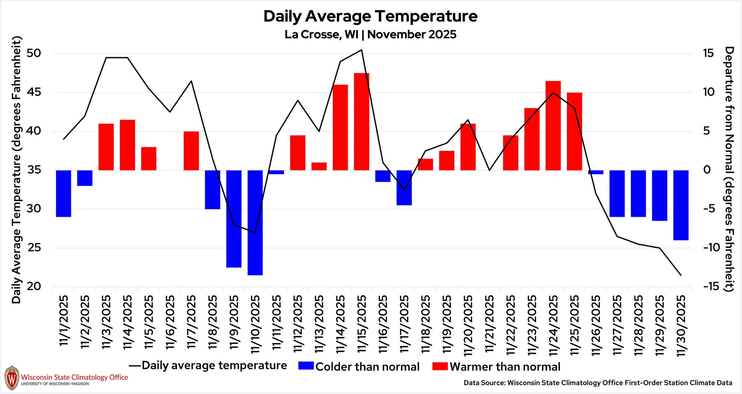 But winter reclaimed control during the final week of the month, when a strong cold front brought a drastic cooldown and the coldest temperature of both November and fall — three degrees below zero — recorded on November 30 in Lone Rock (Sauk County).