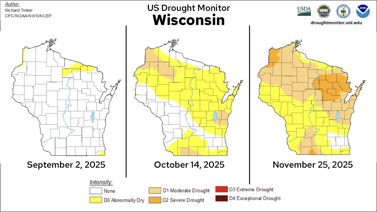 Dry periods in September and October caused abnormal dryness (D0) to spread across northern, eastern, and southern Wisconsin, with pockets of moderate drought (D1) emerging. By the end of the season, persistent dry weather allowed for severe drought conditions (D2) in parts of northwest, northeast, and far southern Wisconsin (Figure 10).