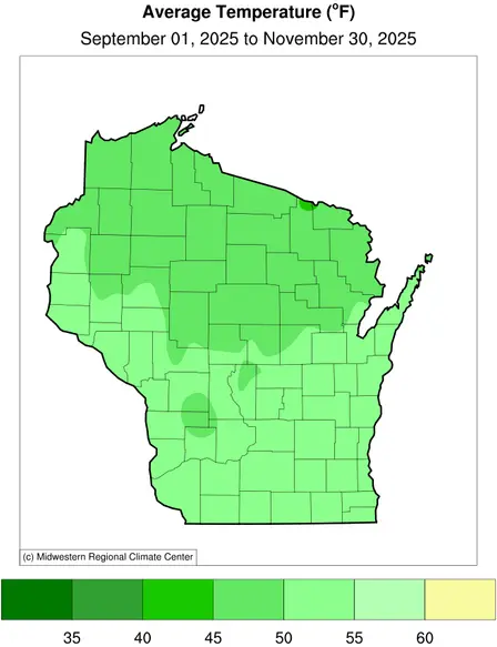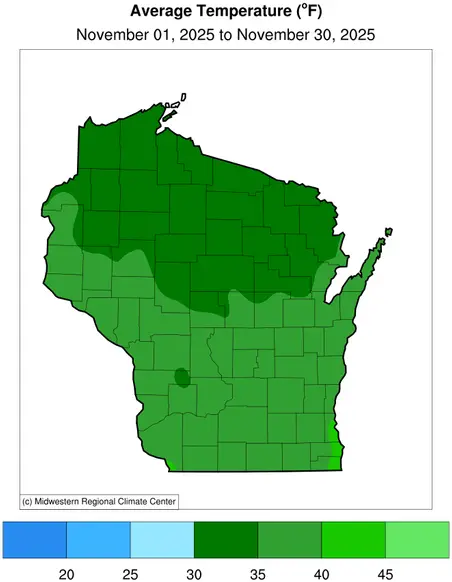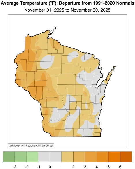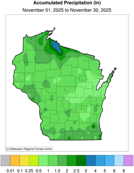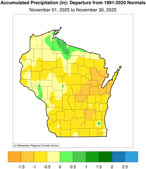 November’s dry conditions and late-month chill had important implications for Wisconsin’s agricultural landscape. Before the late-November snow arrived, grass and topsoil began to turn crunchy under the deepening cold.
