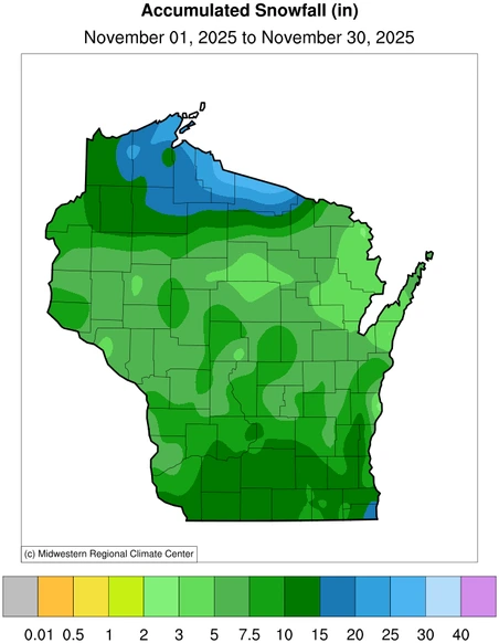 It was southern Wisconsin’s turn from November 29 to 30, as steady snowfall laid nine to 12 inches of snow across the region. The heaviest snow fell in counties bordering the Illinois stateline, where totals over 14 inches were reported.