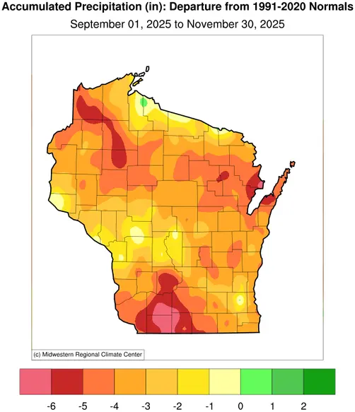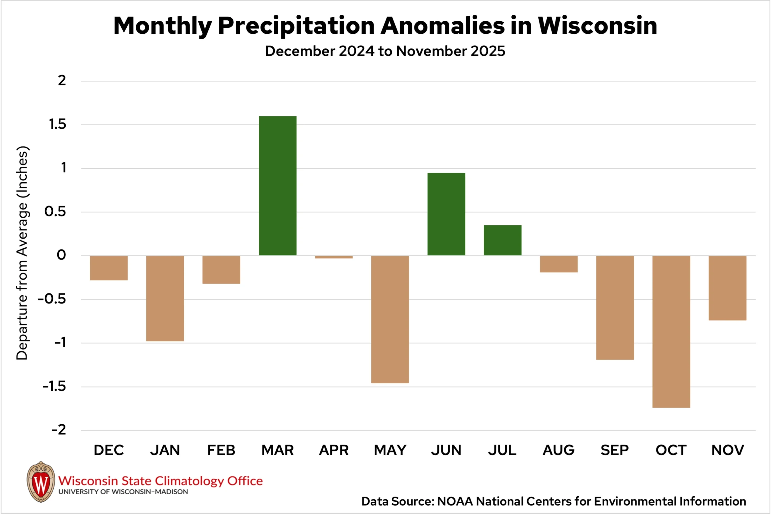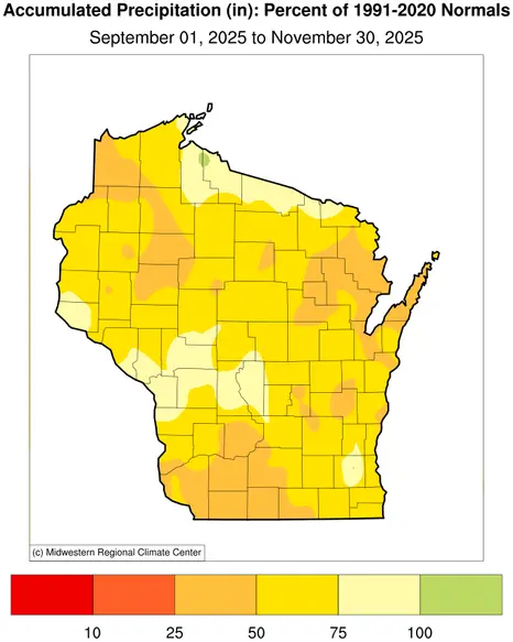 November was characterized by dry conditions, which caused drought to spread and intensify across Wisconsin. Though the growing season has come to an end, having moisture in the soil before frost sets in is crucial in setting up the next growing season for success.