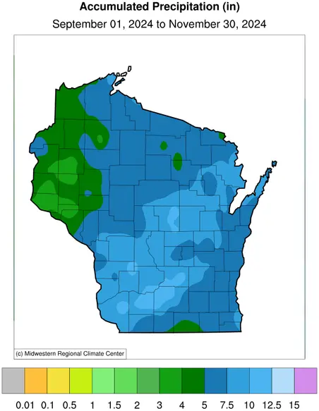 Due to the parched conditions, over 200 wildfires burned in the state during the fall season, many of which were sparked by machinery. Following the major flood event in August, Waukesha and Milwaukee are the only counties in the state still reporting normal soil moisture.