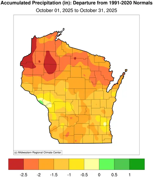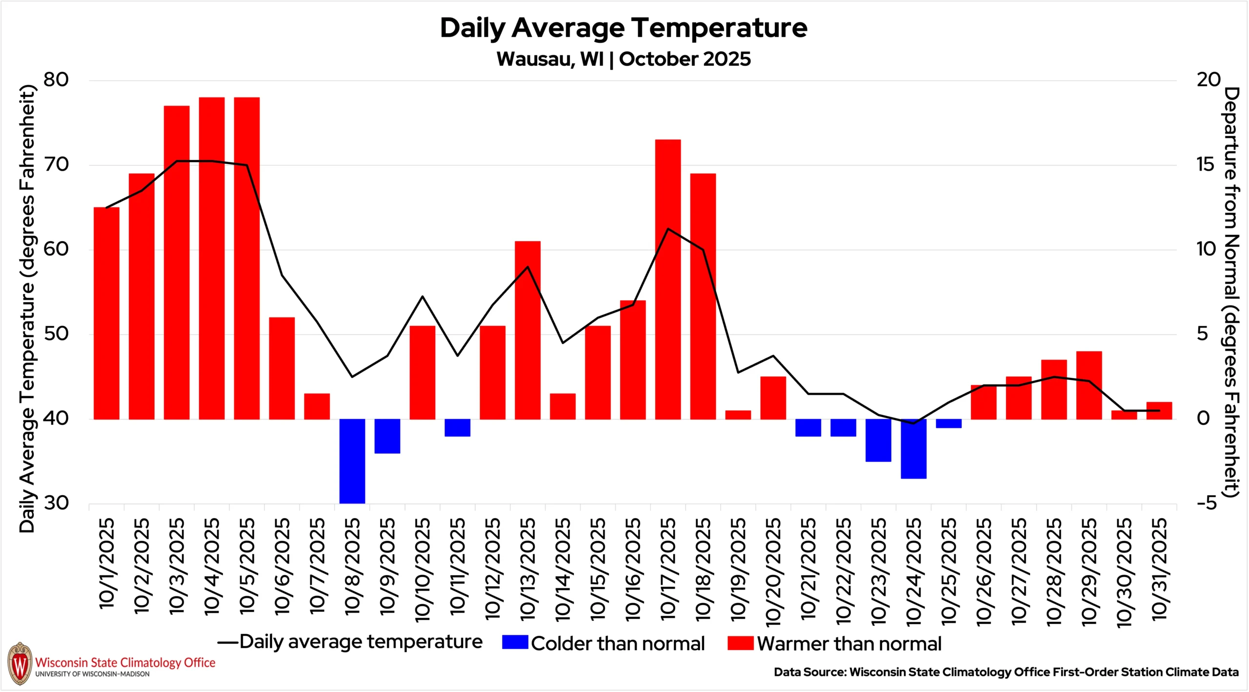 Wisconsin’s first-order stations reported between nine and 12 days with measurable precipitation during the month (which is near average for October), but the precipitation that fell didn’t add up to much. Wausau saw 12 days with precipitation, yet still had its driest October since 2003 with a monthly total barely over an inch.
