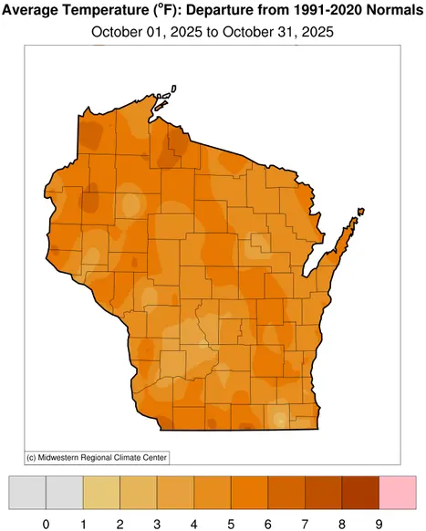 Statewide, October averaged a preliminary 51.9 degrees, 5.1 degrees above average and estimated to be Wisconsin’s thirteenth warmest October on record (Figure 2).