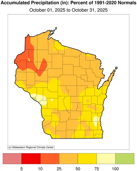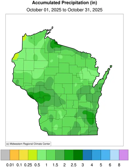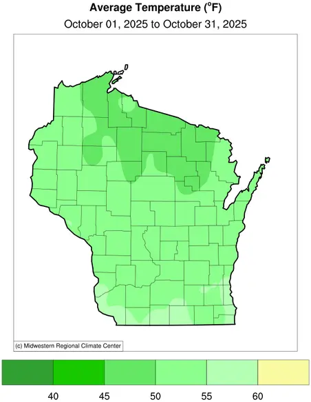 After another warm stretch from October 12 to 20, cooler conditions returned late in the month. Couderay (Sawyer County) and Ladysmith (Rusk County) recorded the state’s coldest temperature of 19 degrees on October 24 and 25, respectively.