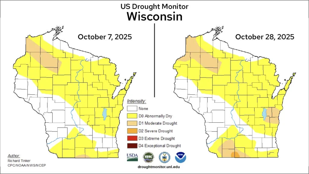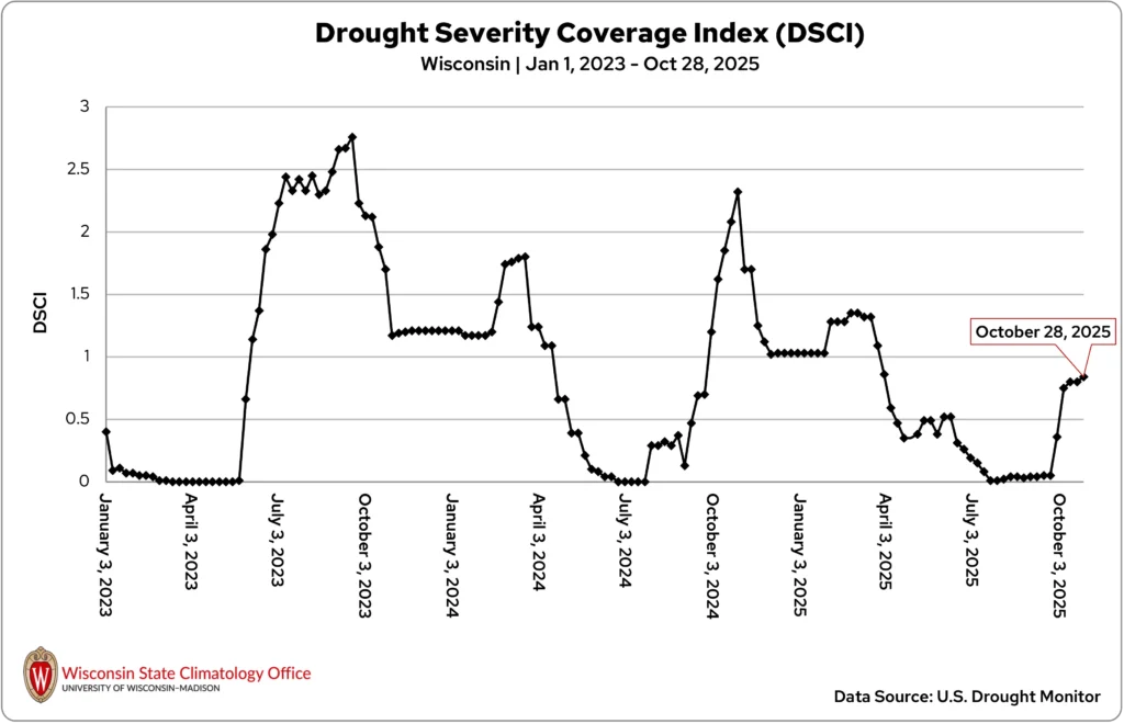 September ended with abnormally dry conditions across northern and southern Wisconsin, and continued dryness in the first week of October allowed moderate drought (D1) to return to the state. This is reflected in the significant jump in the Drought Severity Coverage Index from September 30 to October 7 (Figure 4).