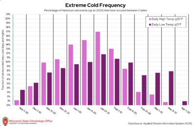 Oneida County can get quite chilly once winter rolls around! Some of our coldest days of the year in Wisconsin are when the overnight low temperatures dip below 0°F. The State Climatology Office performed an analysis on the likelihood of a “very cold day” (daily high temperature ≤ 10°F) or “very cold night” (daily low temperature ≤ 0°F) occurring between two calendar dates using historical measured temperature data from NOAA stations in Oneida County. Based on this analysis, very cold days and nights have occurred most frequently between January 21 to 31. Over the past 20 years (2005-2024), Oneida County experienced, on average, 16 very cold days per year and 49 very cold nights per year.