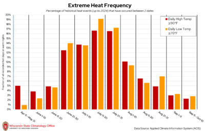 Despite being one of Wisconsin’s most northern counties, Oneida County is no stranger to sweltering summer heat, where daytime temperatures can top 90°F or even 100°F. But when are these hot days most likely to occur in Oneida County? The State Climatology Office analyzed the likelihood of a “hot day” (daily high temperature ≥ 90°F) or “warm night” (daily low temperature ≥ 70°F) occurring between two calendar dates using historical measured temperature data from NOAA stations in Oneida County. Based on this analysis, hot days have occurred most frequently between July 11 to 31. Mid-July (11-20) is when warm nights have been the most common. Over the past 20 years (2005-2024), Oneida County experiences, on average, six hot days per year and two warm nights per year.