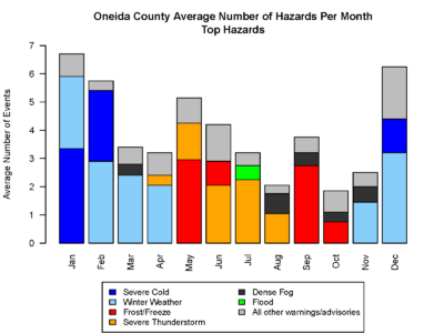 Oneida County deals with an array of hazardous weather throughout the year, and the type of hazards vary from season to season. The bar chart and table above are summaries of warnings and advisories issued by the National Weather Service for Oneida County over the past 20 years (2005-2024). Looking at hazards by month/season, the months of November through April are characterized by severe cold and snow events. Severe thunderstorms and flooding are more common in the late spring through summer when thunderstorms and heavy rain are more common. Frost advisories and freeze warnings are most common in May and September, as these are the times of year when we are transitioning into or out of the growing season, and plants are susceptible to frost. Overall, the most common hazards in a year in Oneida County are winter weather, frost/freeze, and severe thunderstorms. Tornadoes are less common, with fewer than one tornado warning issued each year for the county, on average.