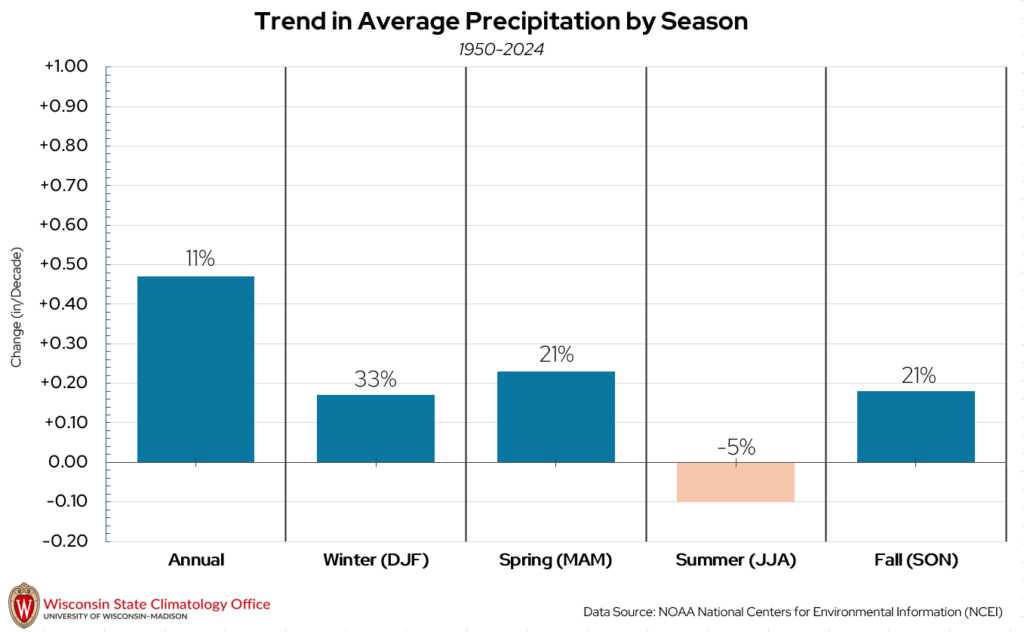 On the annual timescale, precipitation has been increasing at a rate of 0.47″ per decade since 1950, which means an increase of one inch every 21 years. At the seasonal level, spring is the season of largest increase in precipitation in terms of inches per decade (0.23”/decade), but winter is the season with the largest percentage increase from average annual precipitation in the early 1950s (33%). Conversely, summers have been trending drier since 1950 (-0.10″/decade).