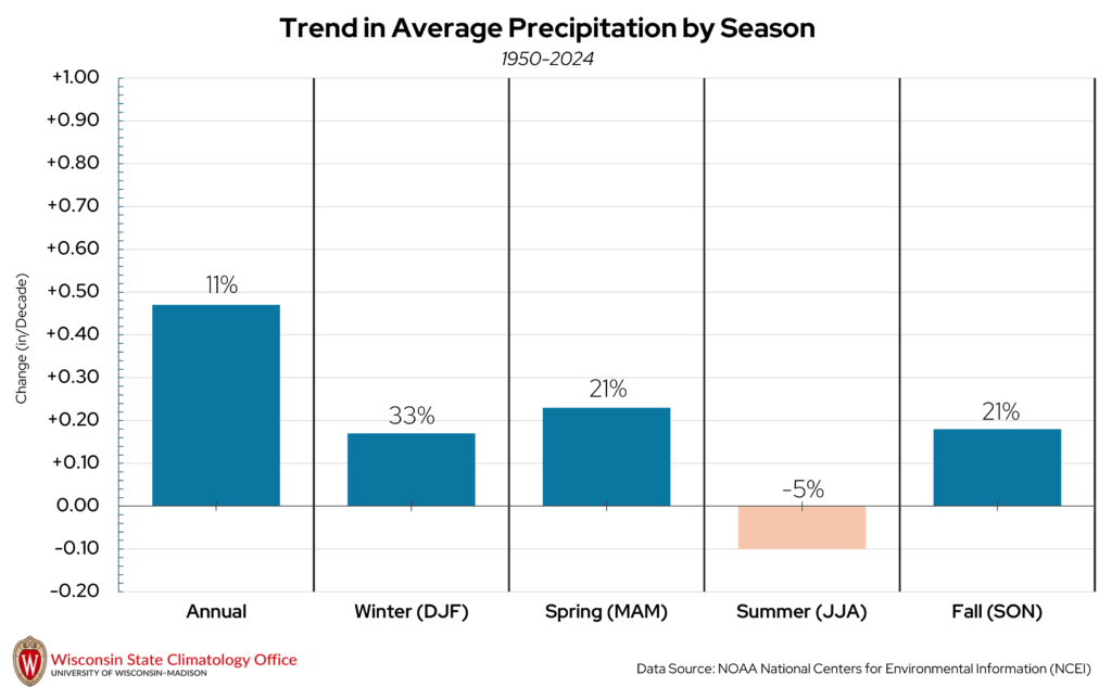 Temperatures have been increasing since 1950 in Oneida County on the annual and seasonal time scales, which is the case for most of Wisconsin. Since 1950, annual average temperatures in Oneida County have increased at a rate of 0.4°F/decade, which translates to an increase of 1°F every 25 years. This increase in temperature has been most pronounced in the winter months and less pronounced in the other seasons. When annual average temperatures are split into daily high and low temperatures, low temperatures have been warming at a faster rate compared to high temperatures.