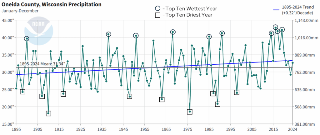 Annual precipitation shows a lot of year-to-year variability. However, there are two notable trends that come from this dataset. First, precipitation is increasing at a rate of 0.32 inches per decade from 1895 to 2024. That’s an increase of one inch approximately every 31 years. Second, if we look at the top ten wettest years since 1895 (black circles), four have occurred within the past 20 years. By contrast, of the top ten driest years (black squares), all occurred prior to 2000. These trends are quite similar to what has been observed in Oneida County with temperatures since 1895.