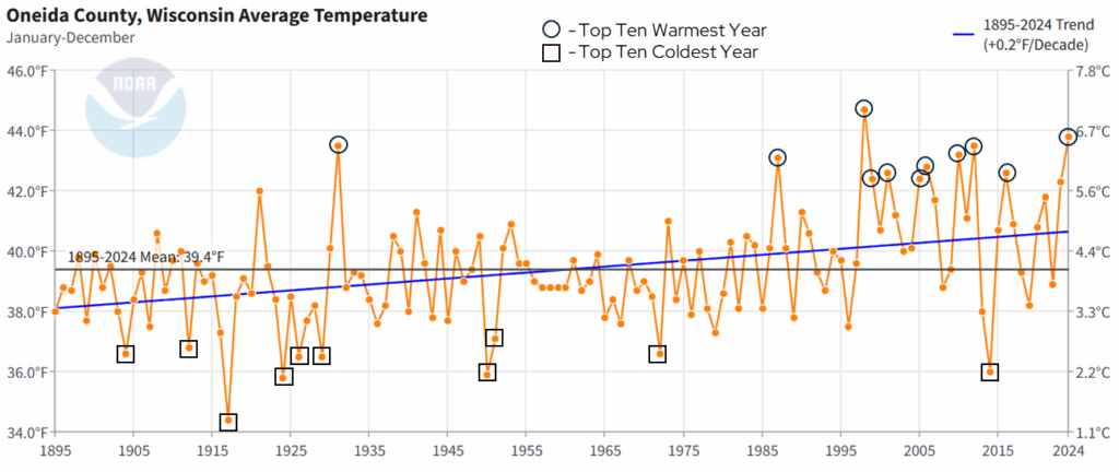 With temperatures warming, this does not mean that every year will be warmer than the last, or that more recent years will all have above-average (1895-2024) temperatures. However, Oneida County is experiencing more years that are above average than it did in the past. For example, since 2000, Oneida County has experienced only six years with below-average temperatures. Similarly, if we rank the top ten warmest years in Oneida County since 1895 (black circles on the above chart), seven have occurred since 2000. The top ten coldest years (black squares) are a bit more spread out over time, with just one of the top ten years occurring since 2000.