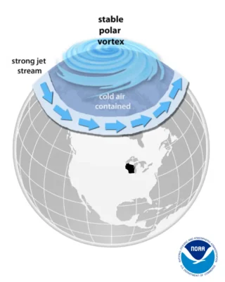 When the polar vortex is stable and strong, the polar jet stream usually stays strong as well. This traps the icy air up north, restricting its impact on Wisconsin. Think of it like swirling a lasso: when you spin it quickly, it creates a nearly perfect circle. In this case, the jet stream is lassoing the cold air.
