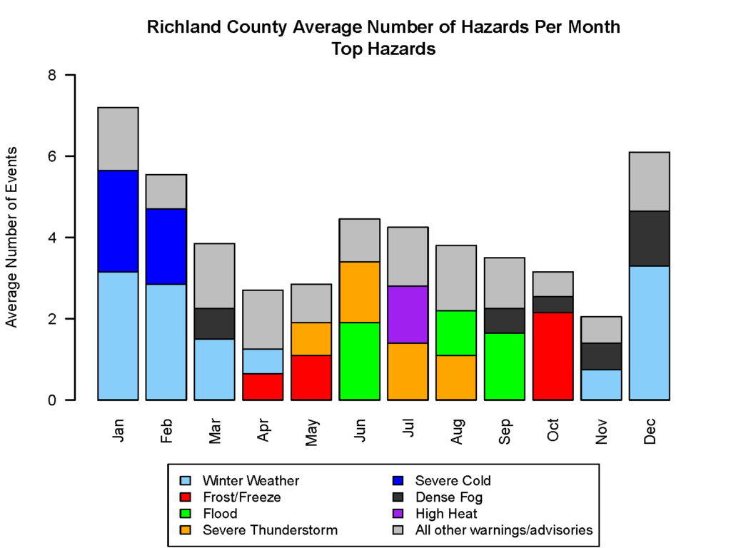 Richland County deals with an array of hazardous weather throughout the year, and the type of hazards vary from season to season. The bar chart and table above are summaries of warnings and advisories issued by the National Weather Service for Richland County over the past 21 years (2005-2025). Looking at hazards by month/season, the winter months are characterized by snow events, severe cold, and dense fog. Severe thunderstorms and flooding are more common in the late spring to early fall when thunderstorms and heavy rain are more common. Frost advisories and freeze warnings are most common in April, May, and October as these are the times of year when we are transitioning into or out of the growing season and plants are susceptible to frost. Overall, the most common hazards in a year in Richland County are winter weather, floods, and dense fog. Tornadoes are more uncommon, with one tornado warning issued per every two years for the county, on average.
