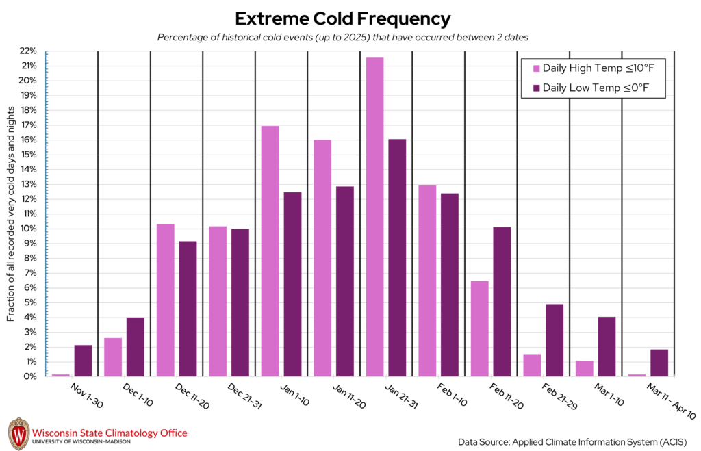 Richland County can get quite chilly once winter rolls around! Some of our coldest days of the year in Wisconsin are when the overnight low temperatures dip below 0°F. The State Climatology Office performed an analysis on the likelihood of a “very cold day” (daily high temperature ≤ 10°F) or “very cold night” (daily low temperature ≤ 0°F) occurring between two calendar dates using historical measured temperature data from NOAA stations in Richland County. Based on this analysis, very cold days and nights have occurred most frequently between January 21 to 31. Over the past 20 years (2006-2025), Richland County experienced, on average, seven very cold days per year and 26 very cold nights per year.