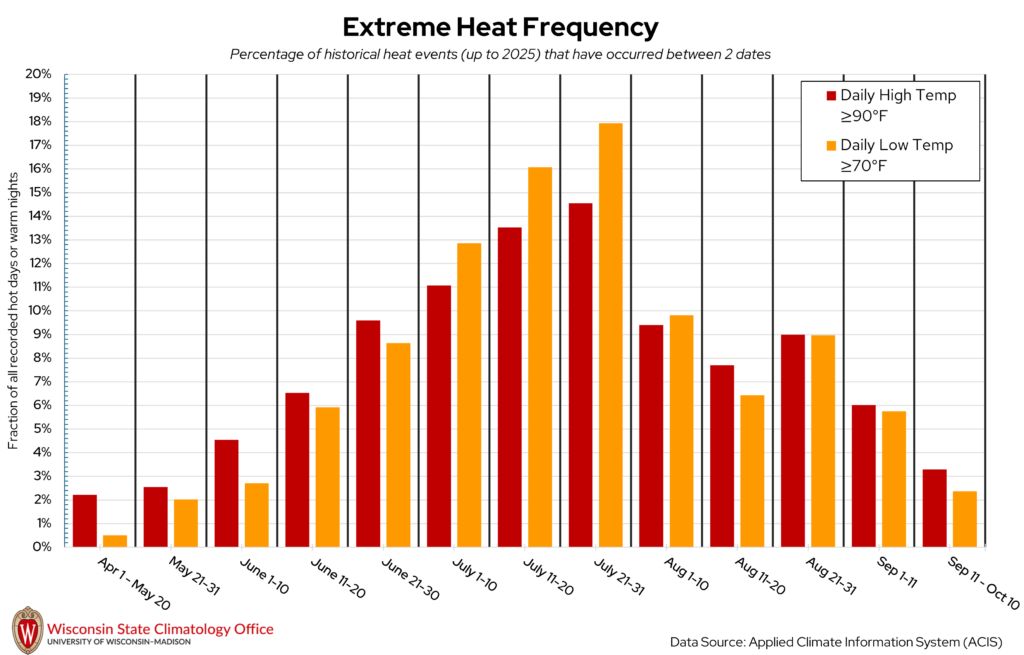 Richland County is no stranger to sweltering summer heat, where daytime temperatures can top 90°F or even 100°F. But when are these hot days most likely to occur in Richland County? The State Climatology Office analyzed the likelihood of a “hot day” (daily high temperature ≥ 90°F) or “warm night” (daily low temperature ≥ 70°F) occurring between two calendar dates using historical measured temperature data from NOAA stations in Richland County. Based on this analysis, hot days and warm nights have occurred most frequently between July 21 to 31. Over the past 20 years (2006-2025), Richland County experiences, on average, 23 hot days per year and nine warm nights per year.