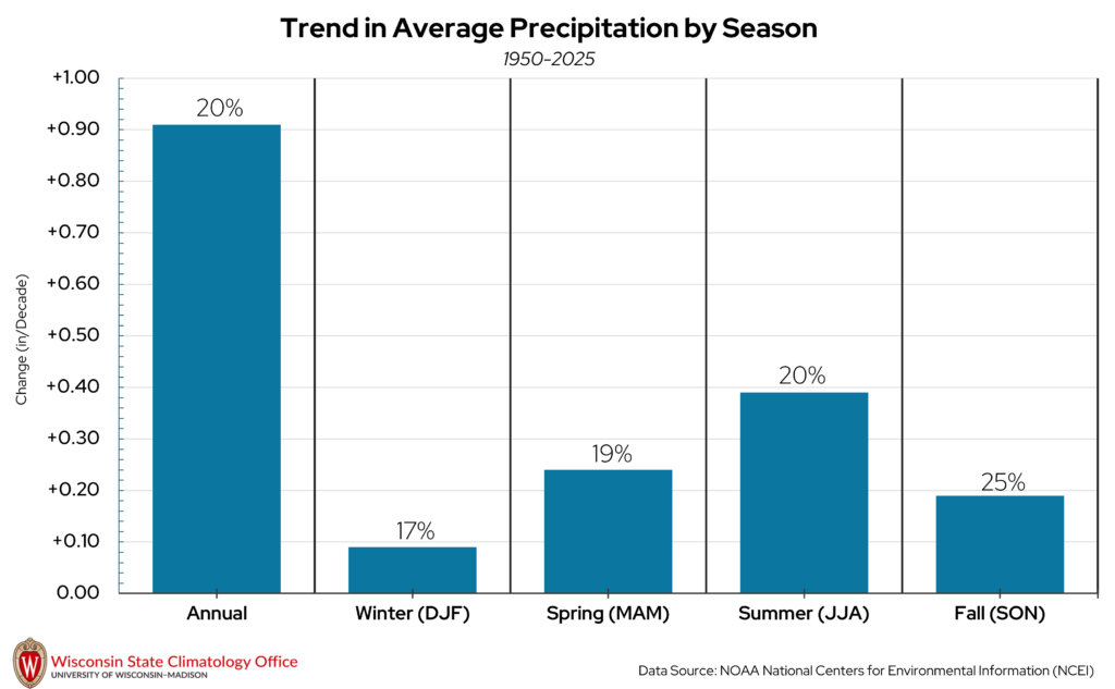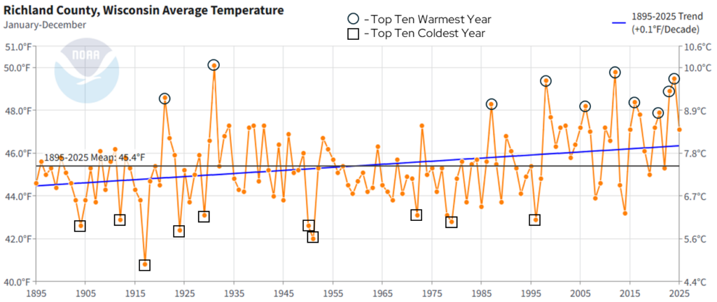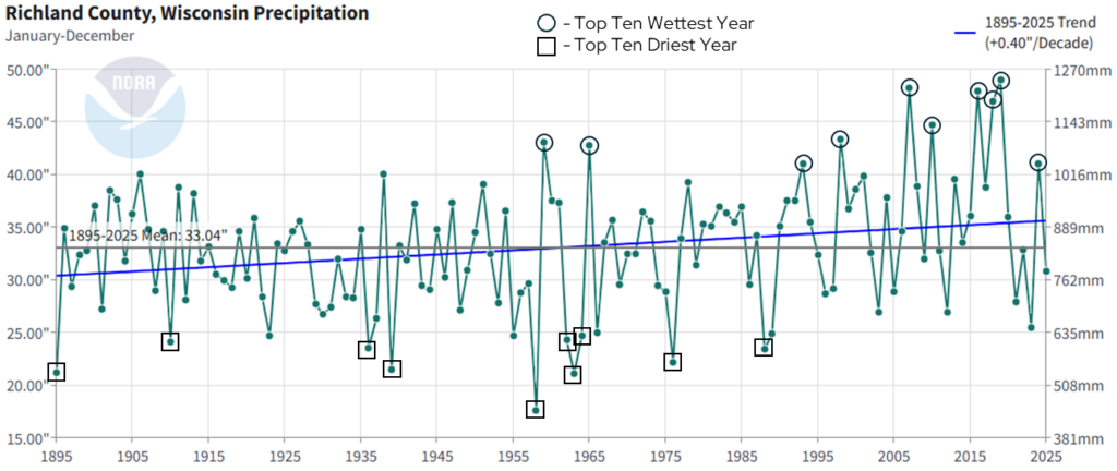 Annual precipitation shows a lot of year-to-year variability, which is normal within a long-term trend. However, there are two notable trends that come from this dataset. First, precipitation is increasing at a rate of 0.40 inches per decade from 1895 to 2025. That’s an increase of one inch approximately every 25 years. Second, if we look at the top ten wettest years since 1895 (black circles), six have occurred within in the past 20 years. By contrast, of the top ten driest years (black squares), all occurred prior to 2000. These trends are quite similar to what has been observed in Richland County with temperatures since 1895.