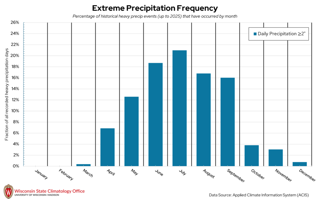 Heavy precipitation days, which for this publication refers to a one-day liquid precipitation total of two inches or more, can impact Richland County at all times of the year. Extreme precipitation in the winter is measured by the amount of liquid that would be present if you melted down all of the snow that fell that day. The vast majority of these heavy precipitation days (73 percent) have occurred from June through September. July is the month that has historically had the most heavy precipitation days in Richland County. In general, summer is the wettest season in Richland County, with winter being the driest season. Over the past 20 years (2006-2025), Richland County experienced, on average, 17 heavy precipitation days per decade.