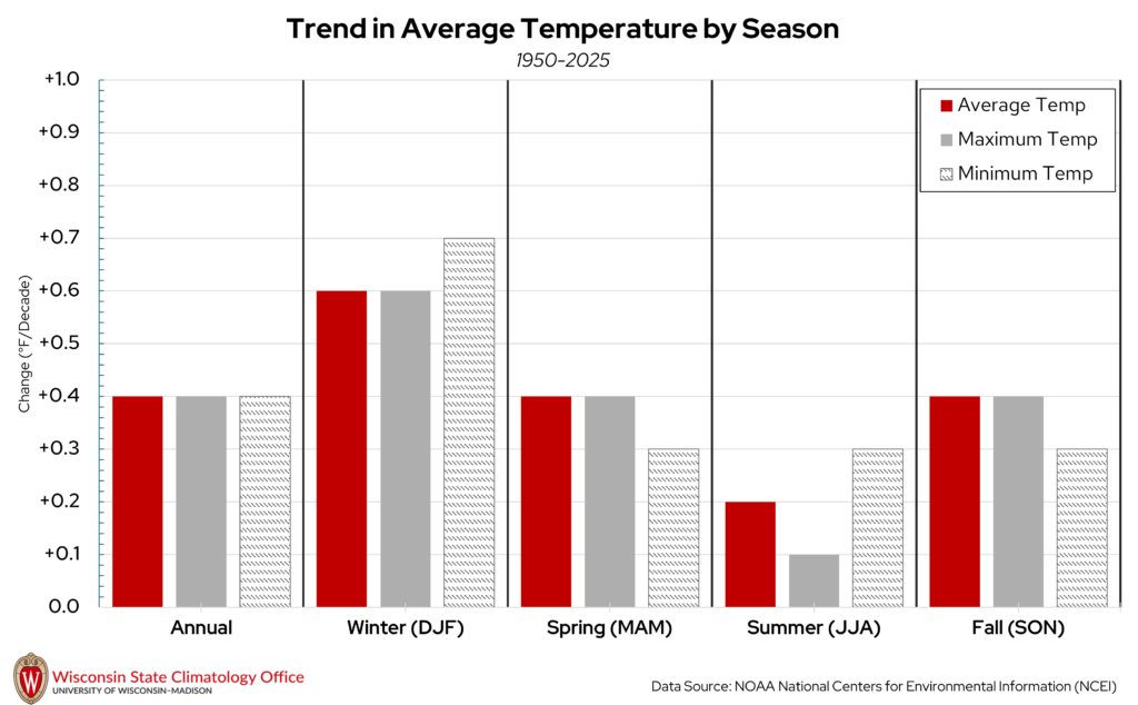 Temperatures have been increasing since 1950 in Richland County on the annual and seasonal time scales, which is the case for most of Wisconsin. Since 1950, annual average temperatures in Richland County have increased at a rate of 0.4°F/decade, which translates to an increase of 1°F every 25 years. This increase in temperature has been most pronounced in the winter months and less pronounced in the summer months. When average temperatures are split into daily high and low temperatures, low temperatures have been warming at a faster rate compared to high temperatures.