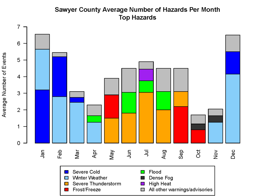 Sawyer County deals with an array of hazardous weather throughout the year, and the type of hazards vary from season to season. The bar chart and table above are summaries of warnings and advisories issued by the National Weather Service for Sawyer County over the past 21 years (2005-2025). Looking at hazards by month/season, the months of November through March are characterized by severe cold and snow events. Severe thunderstorms and flooding are more common in the late spring through summer. Frost advisories and freeze warnings are most common in May, September, and October as these are the times of year when we are transitioning into or out of the growing season, and plants are susceptible to frost. Dense fog advisories are most common in fall. Overall, the most common hazards in a year in Sawyer County are winter weather, severe thunderstorms, and severe cold. Tornadoes are less common, with one tornado warning issued per every two years for the county, on average.