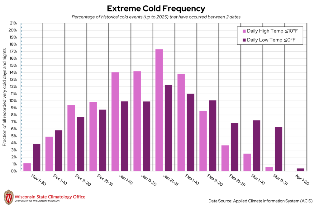 Sawyer County can get quite chilly once winter rolls around! Some of our coldest days of the year in Wisconsin are when the overnight low temperatures dip below 0°F. The State Climatology Office performed an analysis on the likelihood of a “very cold day” (daily high temperature ≤ 10°F) or “very cold night” (daily low temperature ≤ 0°F) occurring between two calendar dates using historical measured temperature data from NOAA stations in Sawyer County. Based on this analysis, very cold days and nights have occurred most frequently between January 21 to 31. Over the past 20 years (2006-2025), Sawyer County experienced, on average, 18 very cold days per year and 47 very cold nights per year.
