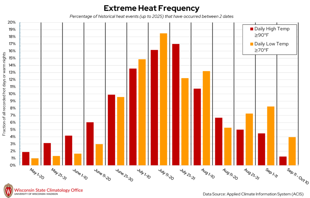 Sawyer County is no stranger to sweltering summer heat, where daytime temperatures can top 90°F or even 100°F. But when are these hot days most likely to occur in Sawyer County? The State Climatology Office analyzed the likelihood of a “hot day” (daily high temperature ≥ 90°F) or “warm night” (daily low temperature ≥ 70°F) occurring between two calendar dates using historical measured temperature data from NOAA stations in Sawyer County. Based on this analysis, hot days have occurred most frequently between July 21 to 31. Warm nights have been most common from July 11 to 20. Over the past 20 years (2006-2025), Sawyer County experienced, on average, nine hot days per year and three warm nights per year.