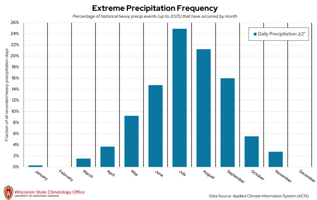 Heavy precipitation days, which for this publication refers to a one-day liquid precipitation total of two inches or more, can impact Sawyer County at all times of the year. Extreme precipitation in the winter is measured by the amount of liquid that would be present if you melted down all of the snow that fell that day. The vast majority of these heavy precipitation days (77 percent) have occurred from June through September. July is the month that has historically had the most heavy precipitation days in Sawyer County. In general, summer is the wettest season in Sawyer County, with winter being the driest season. Over the past 20 years (2006-2025), the City of Hayward experienced, on average, 10 heavy precipitation days per decade.