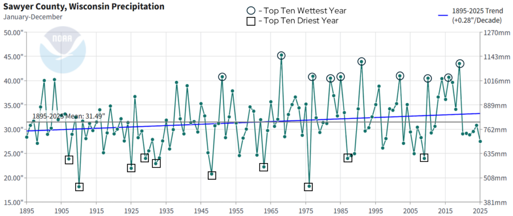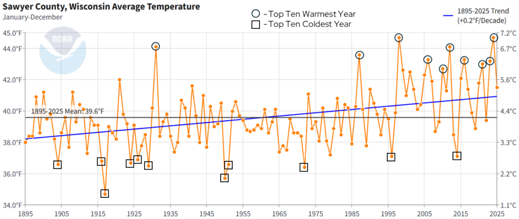 With temperatures warming, this does not mean that every year will be warmer than the last, or that more recent years will all have above-average (1895-2025) temperatures. However, Sawyer County is experiencing more years that are above average than it did in the past. For example, since 2000, Sawyer County has experienced only six years with below-average temperatures. Similarly, if we rank the top ten warmest years in Sawyer County since 1895 (black circles on the above chart), seven have occurred since 2000, with 1998 also ranking in the top ten. The top ten coldest years (black squares) are a bit more clustered towards the earlier years in this time period, with just one of the top ten years occurring after 2000.