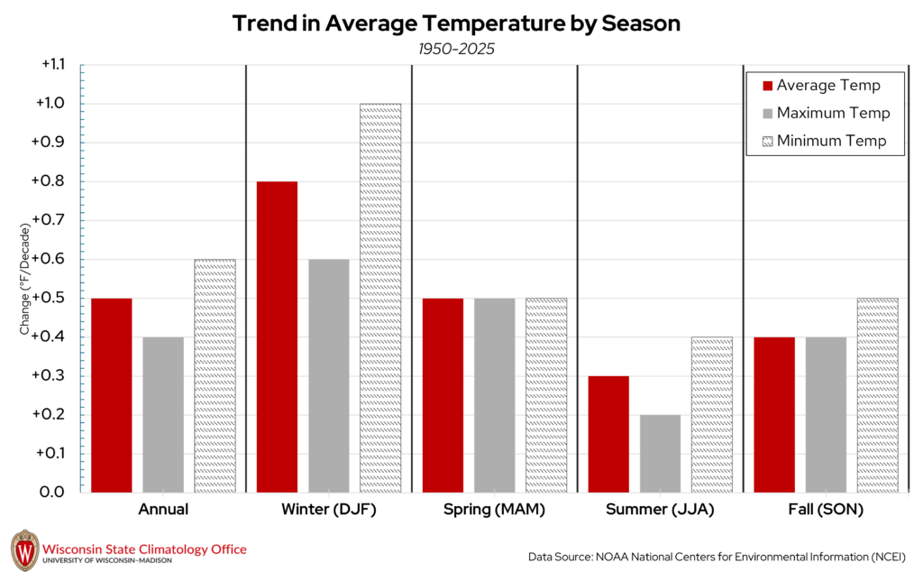 Temperatures have been increasing since 1950 in Sawyer County on the annual and seasonal time scales, which is the case for most of Wisconsin. Since 1950, annual average temperatures in Sawyer County have increased at a rate of 0.5°F/decade, which translates to an increase of 1°F every 20 years. This increase in temperature has been most pronounced in the winter months and less pronounced in the other seasons. When winter average temperatures are split into daily high and low temperatures, low temperatures have been warming at a faster rate (1°F every 10 years) compared to high temperatures (1°F every 17 years).