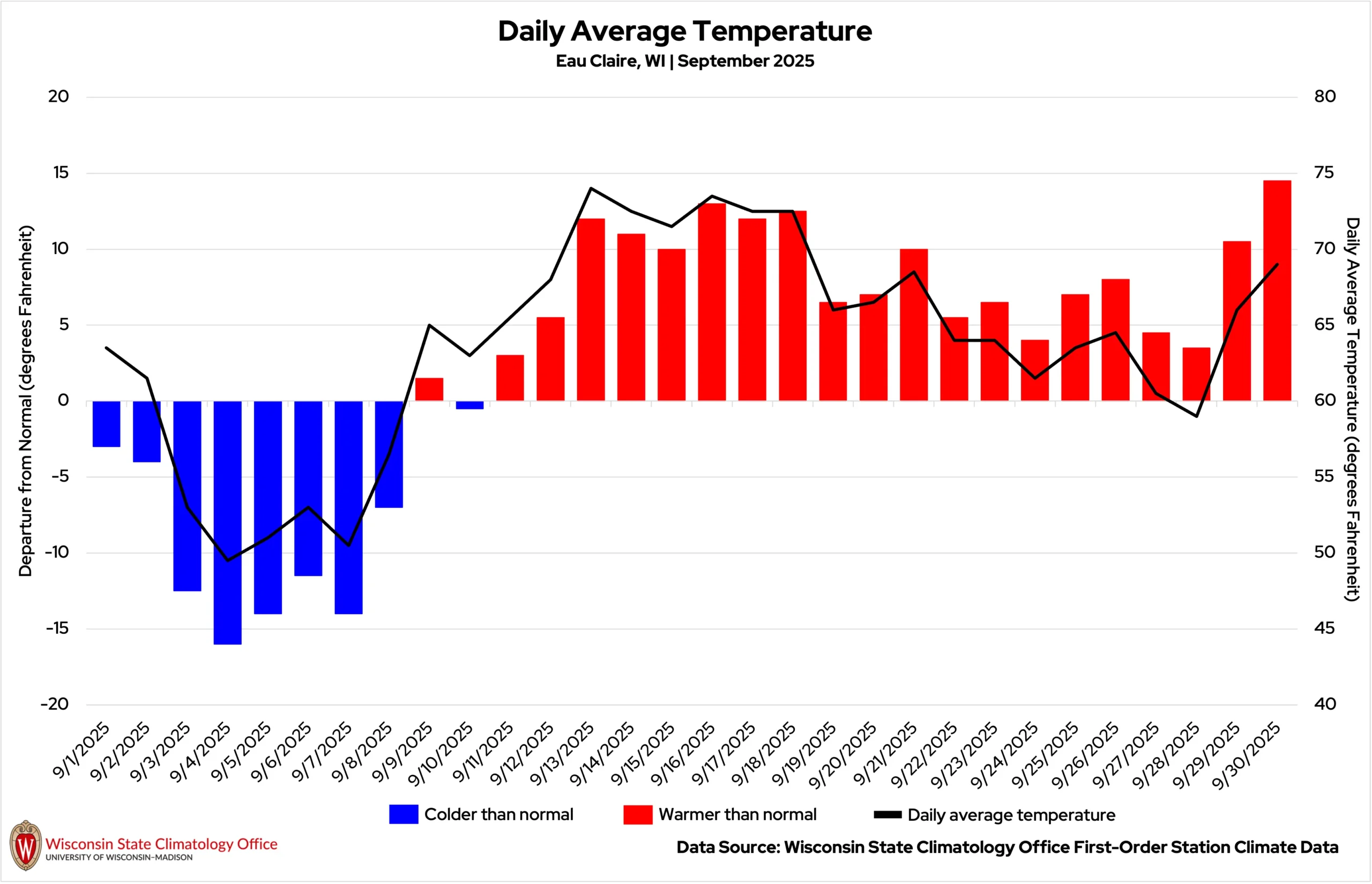 The cool pattern broke quickly, and by mid-September, summer returned in force. Eau Claire logged nine days at least 10 degrees above normal during the second half of the month, and Madison and Wausau notched eight such days.