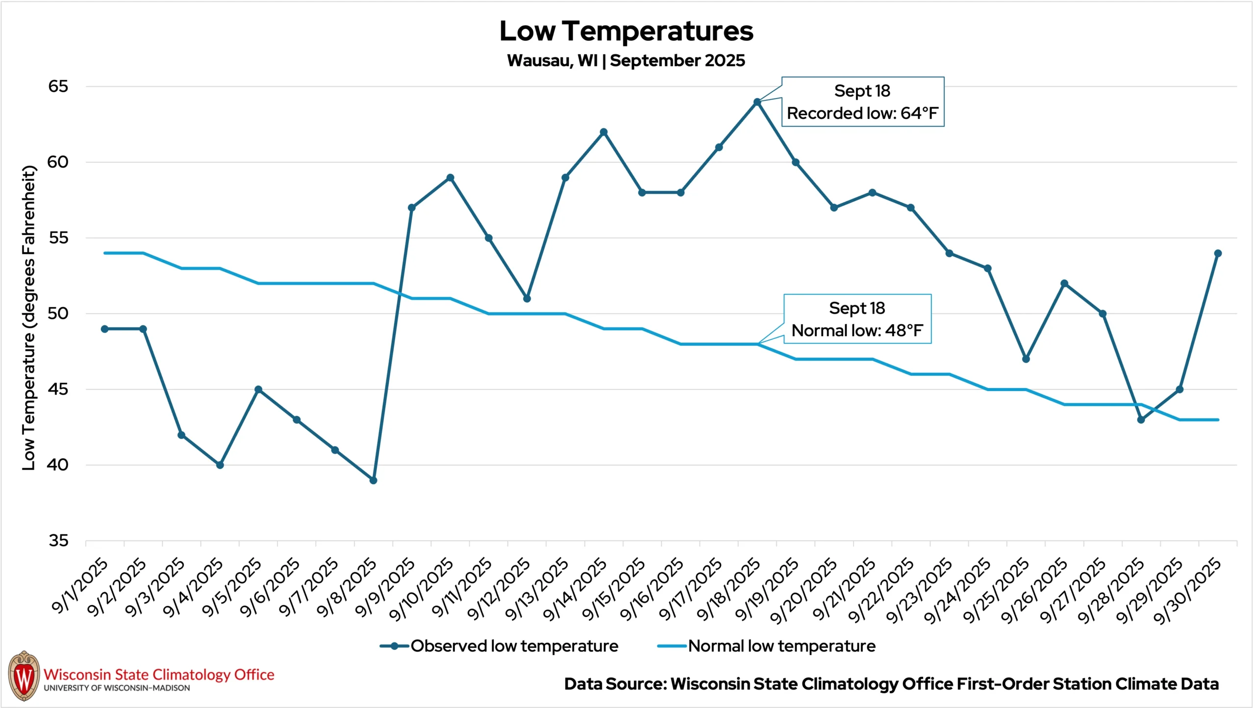 Impressive streaks of above-normal low temperatures were recorded at all six first-order stations, including 19 consecutive days in Wausau and a nighttime temperature as much as 16 degrees warmer than normal recorded on September 18 (Figure 2).