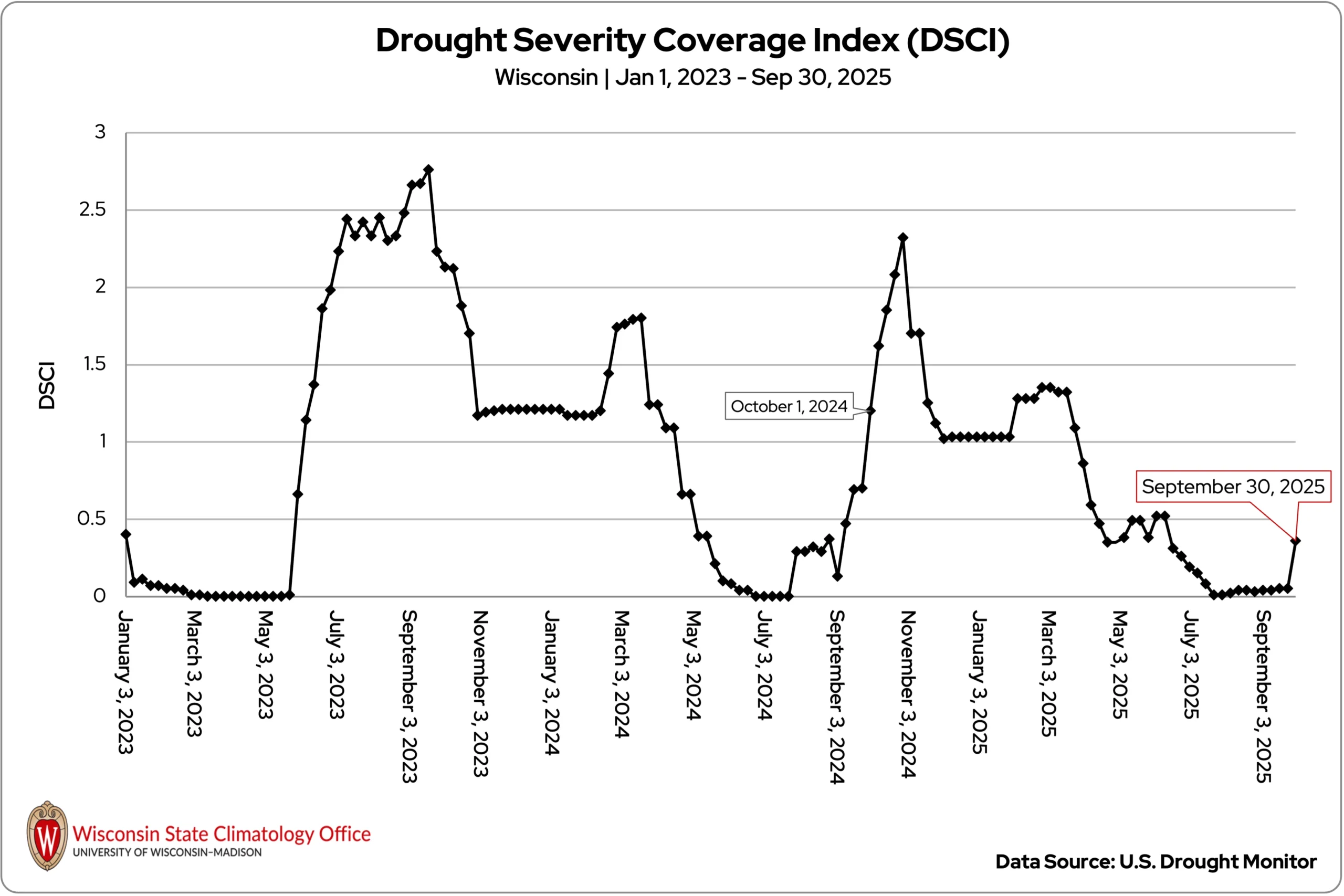 A similar pattern was seen last September: Wisconsin was plagued with stretches of dry weather following a wet summer. By the end of September 2024, conditions were more severe, with many areas of moderate drought (D1) in the state (Figure 7). By the end of October 2024, the entire state was experiencing drought for the first time since at least 2000, with some areas of severe drought (D2). Hopefully, we won’t see a full repeat of that pattern this fall!