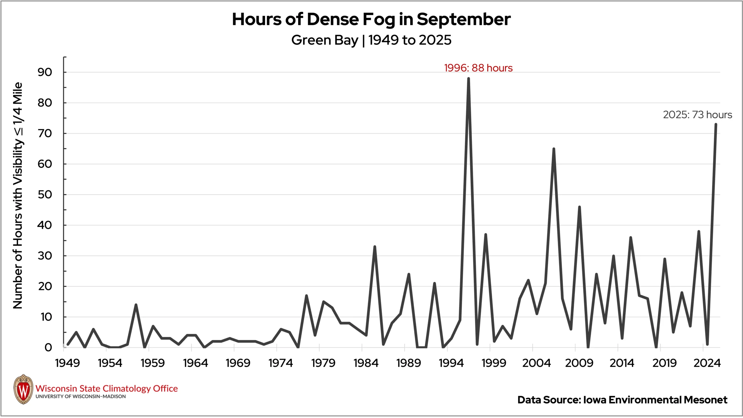 Even farther north, Ashland (Ashland County) experienced its foggiest September on record with 112 hours of dense fog! Eight dense fog advisories were issued for Ashland and Bayfield counties through the month, the most of any month for those counties since 2009.