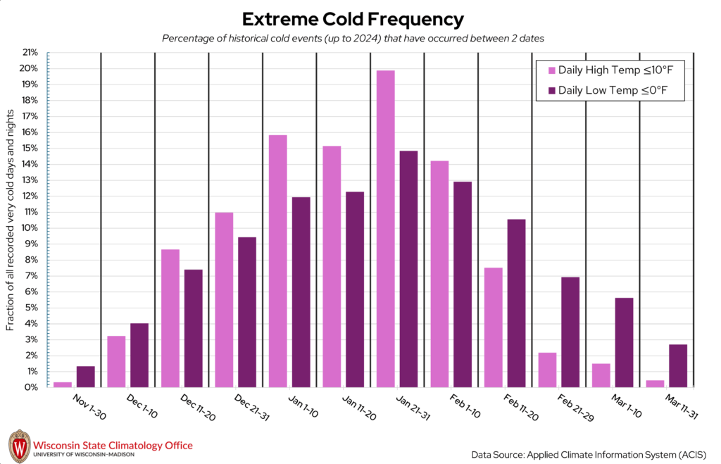 Shawano County can get quite chilly once winter rolls around! Some of our coldest days of the year in Wisconsin are when the overnight low temperatures dip below 0°F. The State Climatology Office performed an analysis on the likelihood of a “very cold day” (daily high temperature ≤ 10°F) or “very cold night” (daily low temperature ≤ 0°F) occurring between two calendar dates using historical measured temperature data from NOAA stations in Shawano County. Based on this analysis, very cold days and nights have occurred most frequently between January 21 to 31. Over the past 20 years (2005-2024), Shawano County experienced, on average, nine very cold days per year and 31 very cold nights per year.