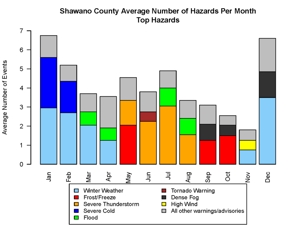 Shawano County deals with an array of hazardous weather throughout the year, and the type of hazards vary from season to season. The bar chart and table above are summaries of warnings and advisories issued by the National Weather Service for Shawano County over the past 20 years (2005-2024). Looking at hazards by month/season, the winter months are characterized by severe cold and snow events. Severe thunderstorms and flooding are more common from mid-spring to late summer when thunderstorms and heavy rain are more common. Frost advisories and freeze warnings are most common in May, September, and October as these are the times of year when we are transitioning into or out of the growing season and plants are susceptible to frost. Overall, the most common hazards in a year in Shawano County are winter weather, severe thunderstorms, and dense fog. Tornadoes are more uncommon, with 1-2 tornado warnings issued each year for the county, on average. June is the month where tornado warnings are most common in Shawano County.