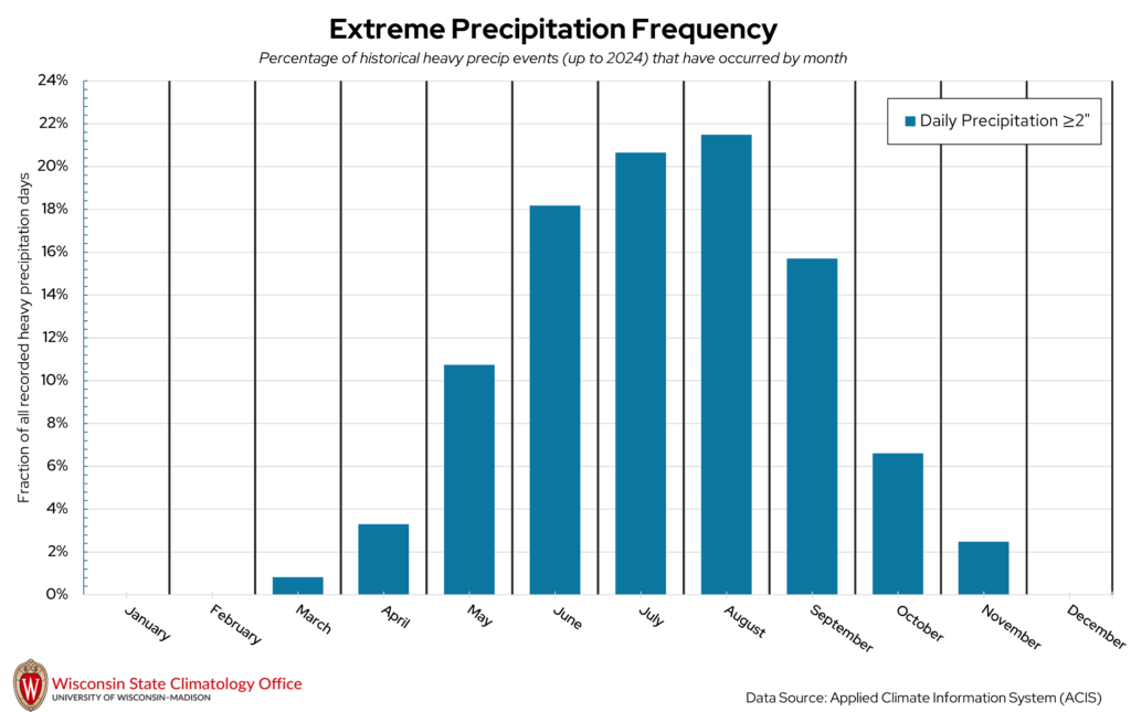 Heavy precipitation days, which for this publication refers to a one-day liquid precipitation total of two inches or more, can impact Shawano County at all times of the year. Extreme precipitation in the winter is measured by the amount of liquid that would be present if you melted down all of the snow that fell that day. The vast majority of these heavy precipitation days (76 percent) have occurred from June through September. August is the month that has historically had the most heavy precipitation days in Shawano County. In general, summer is the wettest season in Shawano County, with winter being the driest season. Over the past 20 years (2005-2024), the City of Shawano experienced, on average, 11 heavy precipitation days per decade.