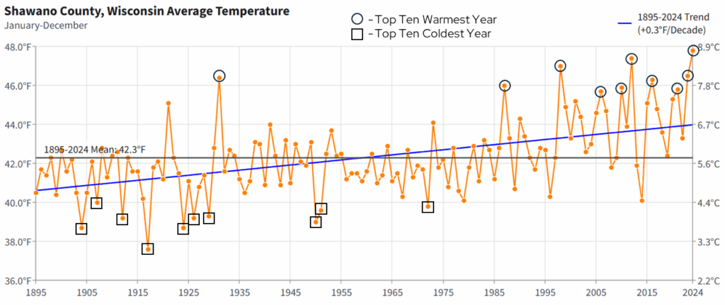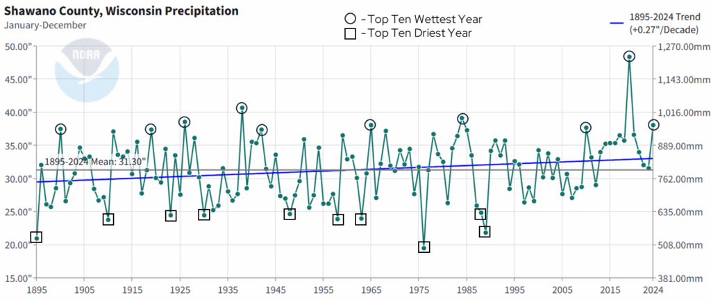 Annual precipitation shows a lot of year-to-year variability, which is normal within a long-term trend. However, there are two notable trends that come from this dataset. First, precipitation is increasing at a rate of 0.27 inches per decade from 1895 to 2024. That’s an increase of one inch approximately every 37 years. Second, if we look at the past 20 years (2005-2024), Shawano County has had three of its top ten wettest years since 1895 (black circles) and only six years have been drier than the long-term (1895-2024) average. By contrast, of the top ten driest years (black squares), all occurred prior to 2000. These trends are quite similar to what has been observed in Shawano County with temperatures since 1895.