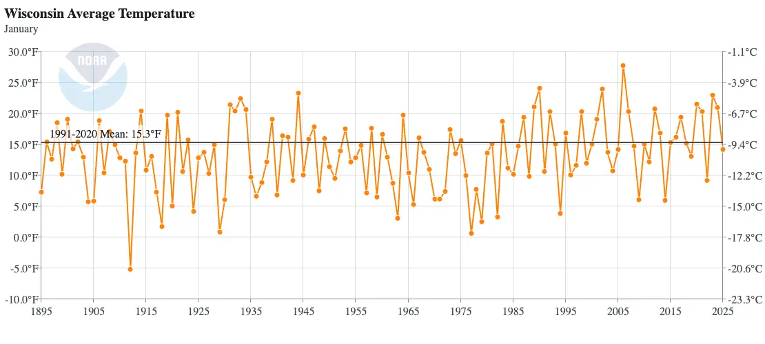 By contrast, Wisconsin’s mildest January was in 2006, when the average temperature was 27.7 degrees. Average highs for the month were above freezing, and many locations saw 50-degree days throughout.