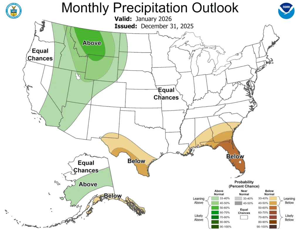 The Climate Prediction Center does not see any significant signal in the precipitation outlook for Wisconsin this month, giving the state equal chances of experiencing above, below, or near average precipitation. Snow-enthusiasts in the Rocky Mountains could be in luck, as the region could see wetter than typical conditions in January.