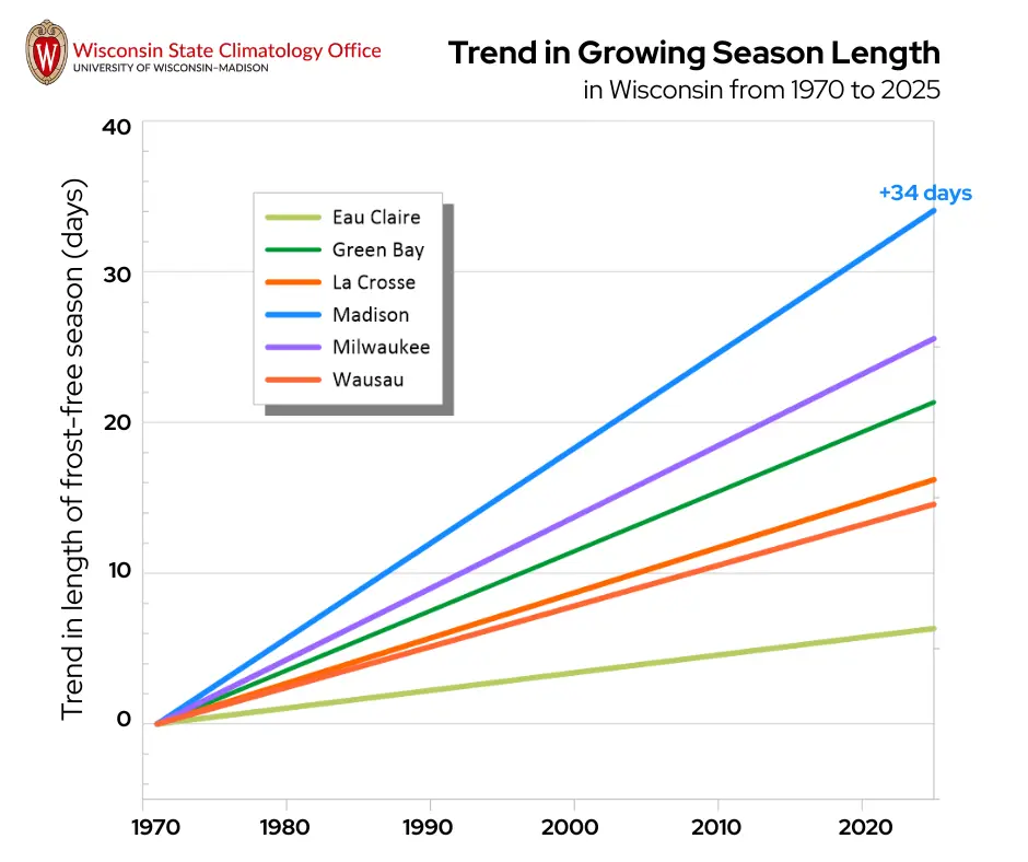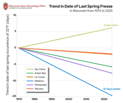 Wisconsin’s springs have been warming in recent decades, which has caused the freezing season to end earlier. Many locations in Wisconsin have seen the final spring freeze occur one to two weeks earlier than it used to.