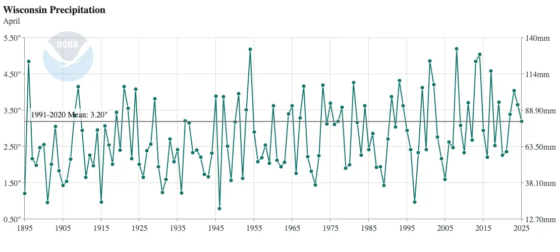 The driest April on record was in 1946, when less than an inch of precipitation fell across Wisconsin during the whole month. The official statewide average total was 0.79 inches, which is 2.41 inches below normal. Both Rhinelander and Wausau received less than a half inch of precipitation that month. That spring as a whole ranked as Wisconsin’s seventh driest on record.