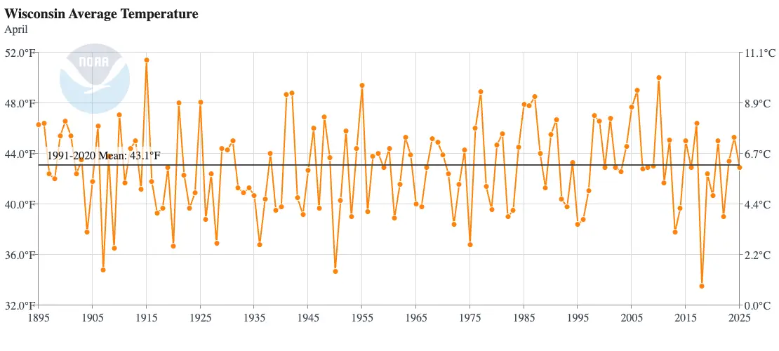Though April temperatures can still bring Wisconsinites on a wild ride, winter’s cold generally begins to fade away. Average high temperatures climb through the 50s during the month, though average low temperatures remain near freezing. Overall, the statewide average temperature for April is 43.1 degrees Fahrenheit.